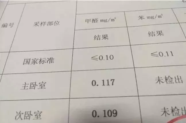 孩子睡的房間甲醛含量達到0.117mg/m3,其他一直敞開的房間甲醛數(shù)值為0.109mg/m3。已超過甲醛衛(wèi)生標準為≤0.1mg/m3。