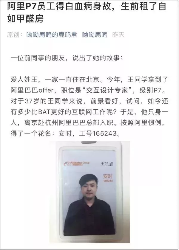 也是在今年,阿里p7級員工王某今年1月租住自如的房間,僅僅半年后患急性髓系白血病身故。去世后,其妻檢測其所住房間發(fā)現(xiàn)甲醛超標。